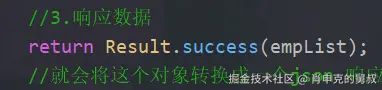 响应数据:在Result(前面提到过的统一响应结果)中 用到success方法 传递了响应回去的数据(这个集合),再经过 @ResponseBody 这个注解的处理,就会将这个对象转换成一个json 响应回客户端。(详细点就是Controller完成了这个业务逻辑后将数据返回给web服务器端,再由web服务器响应数据回客户端(浏览器),这样在浏览器中就可以看到效果啦~)