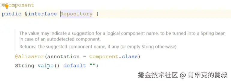 所以我们现在有四个注解可以用来声明一个Bean,而每个Bean其实都有自己的名字,我们随便看一个注解的源码: