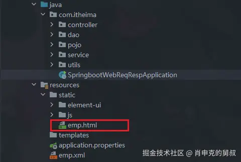 直接开门见山了哈,首先确保后端程序跑起来了哈,接着前端发送过来一段请求:http://localhost:8080/emp.html,可以看到这里的8080/后面是一个前端页面的代码文件emp.html,所以就先访问了我idea中的此文件