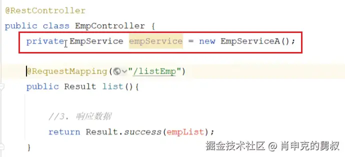 回到刚刚三层架构中,Controller层去调用了Service层(new了一个Service层的实现类)一旦这样做了之后,如果Service层中的这个实现类名字发生了变化/或者我们要切换一个实现类 如:EmpServiceB,那Controller层中的代码就必须改,不然就报错 ,同理:Service层去调用了dao层(new了一个dao层的实现类),该实现类一有变动,Service层中的代码也得跟着变。