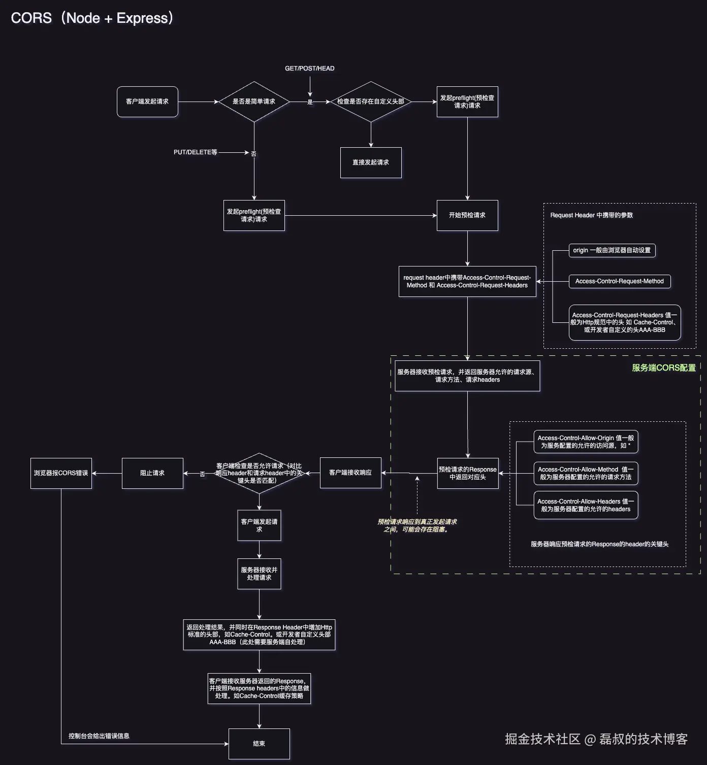 如果留心,可以看到流程图中,有一个标注“预检请求响应到真正发起请求之间,可能会存在阻塞”,这个问题请看 什么是 preflight 小节.