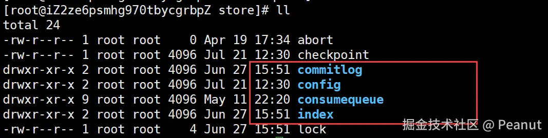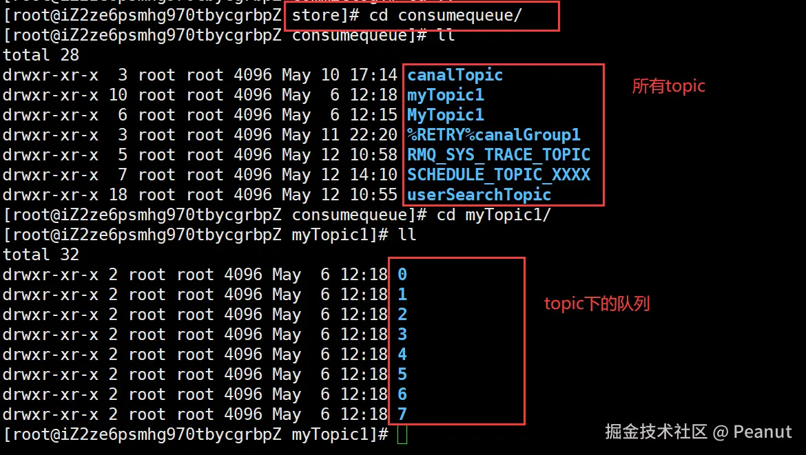 - consumeQueue存了所有topic的consumeQueue文件,如果一个topic有n个队列,那么每个topic文件夹下还有n个文件夹,表示n个consumeQueue,每个队列一个文件夹(因为可能一个文件不够存)。