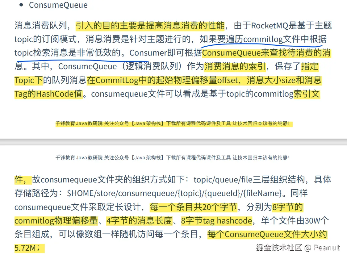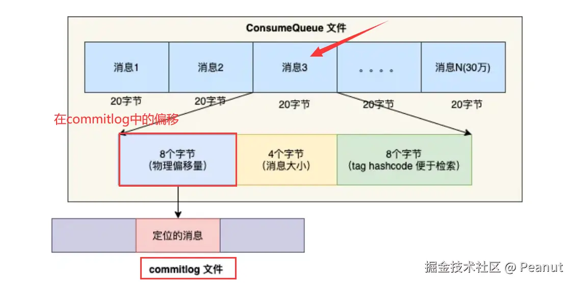 - 理解:实体消息都是在CommitLog这个文件中,不管是哪个topic的消息,都是追加写入CommitLog。而ConsumerQueue又是另一个文件,一个ConsumerQueue对应topic中的一个队列,ConsumerQueue中每个条目存储的不是实际的消息,而是消息在CommitLog中的偏移量offset及消息的大小,所以可以将ConsumerQueue这个文件看成一个索引文件。而且consumerQueue的每个记录都是固定大小20字节。