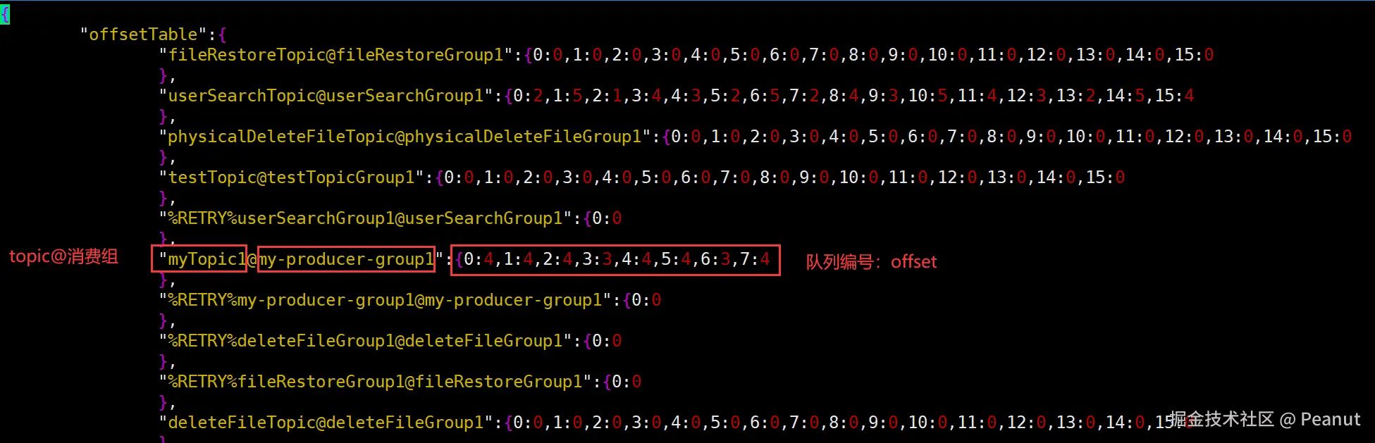 在进度文件 consumerOffset.json 里,数据以 key-value 的结构存储,key 表示:主题@消费者组 , value 是 consumequeue 中每个队列对应的逻辑偏移量 。