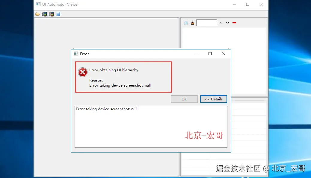 1、以前运行工具没有问题。今天使用uiautomatorviewer 查看android某些页面元素,出现错误Error obtaining UI hierarchy Reason: Error taking device screenshot: null 如图: