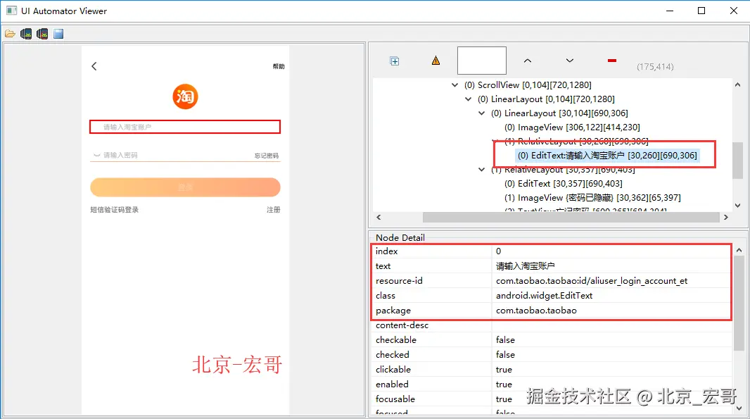 对比两种代码的写法,我们可以发现他们的相同之处只是最后的定位信息是一样的,即:new UiSelector().text("请输入淘宝账户"),这句话是什么意思呢?简单的话就是根据一定条件来查找元素,我们这里的条件就是text属性为“请输入淘宝账户”,再根据图片去理解是不是很容易呢?android uiautomator的元素定位其实和appium的定位一样,或者说它比appium的定位方式更加多以及更加适用,并不是只有这一个,它也不仅支持className、id等定位,而且还支持模糊匹配进行定位,这样是不是感觉更高大上呢?下面我们简单介绍一下这几种定位方式。