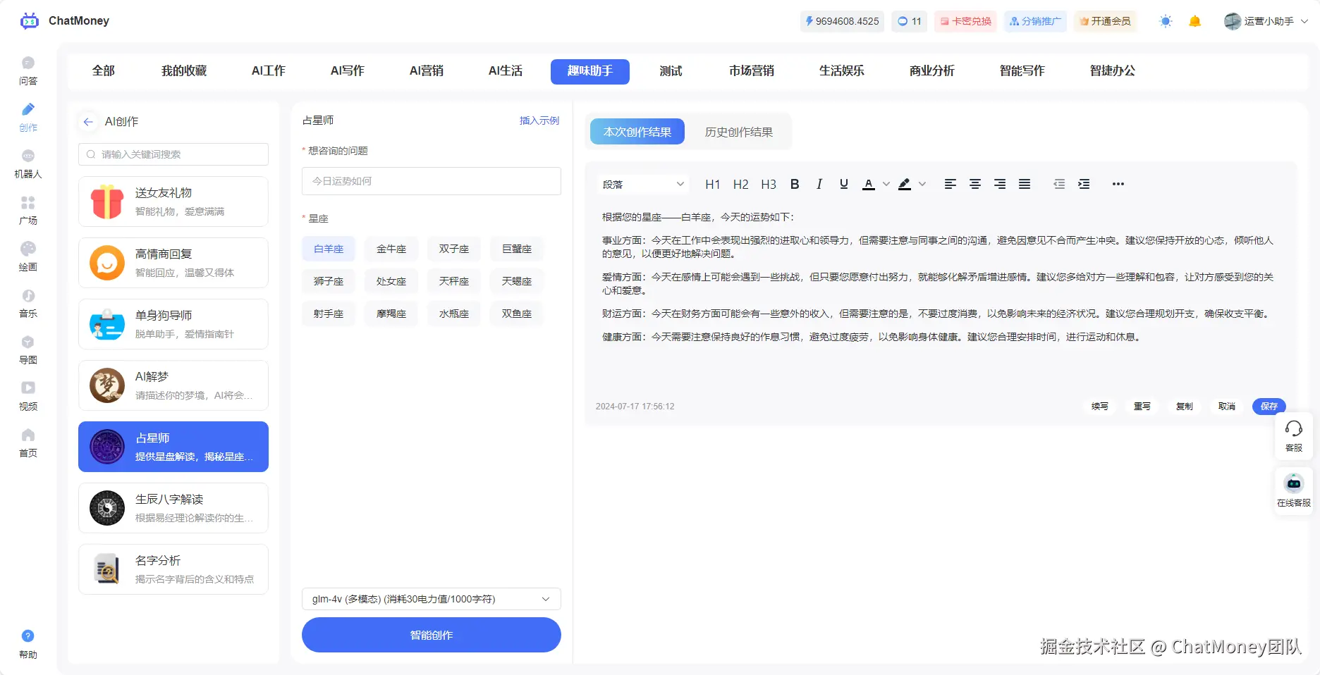 2. 输入想要咨询的问题,选择星座,AI占星师就会开始帮你占星啦!