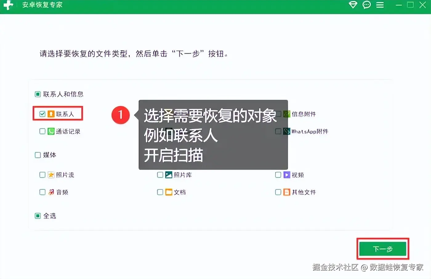 步骤2:选择需要恢复的数据类型,然后点击 【下一步】 。软件将开始对手机存储进行全面扫描,查找可恢复的数据。