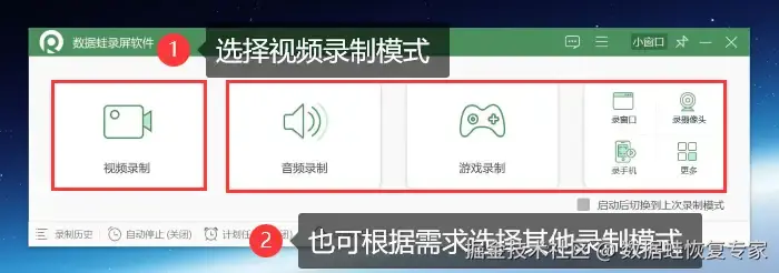 步骤2:安装完毕后进入软件的主界面,电脑录屏常用 【视频录制】 模式。您也可以根据您的需求选择其他录制模式。