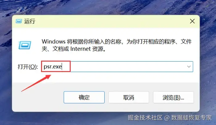 步骤2:在 【运行】 页面的输入框中输入 【psr.exe】 ,点击 【确定】 即可进入录制屏幕。