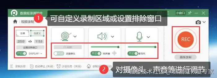 步骤3:进入 【视频录制】 页面,可以自由选择录制的范围并对摄像头、麦克风、扬声器状态进行调节,接着点击 【REC】 按钮开始录制。