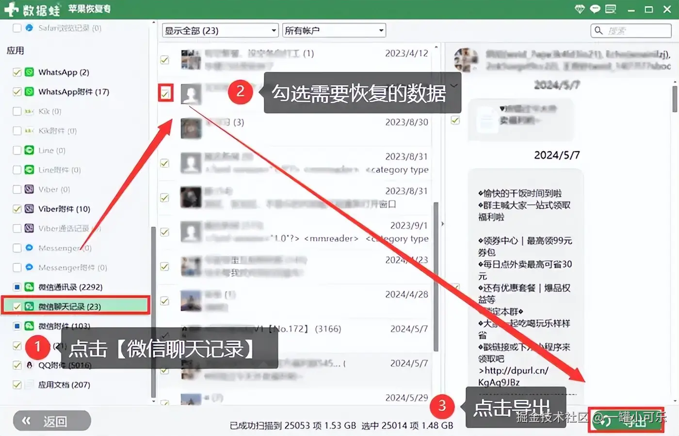 步骤3:选择导航栏中的 【微信】 选项,点击进去,就会显示你的好友,再选择好友,选择需要恢复的聊天,点击 【导出】 即可。