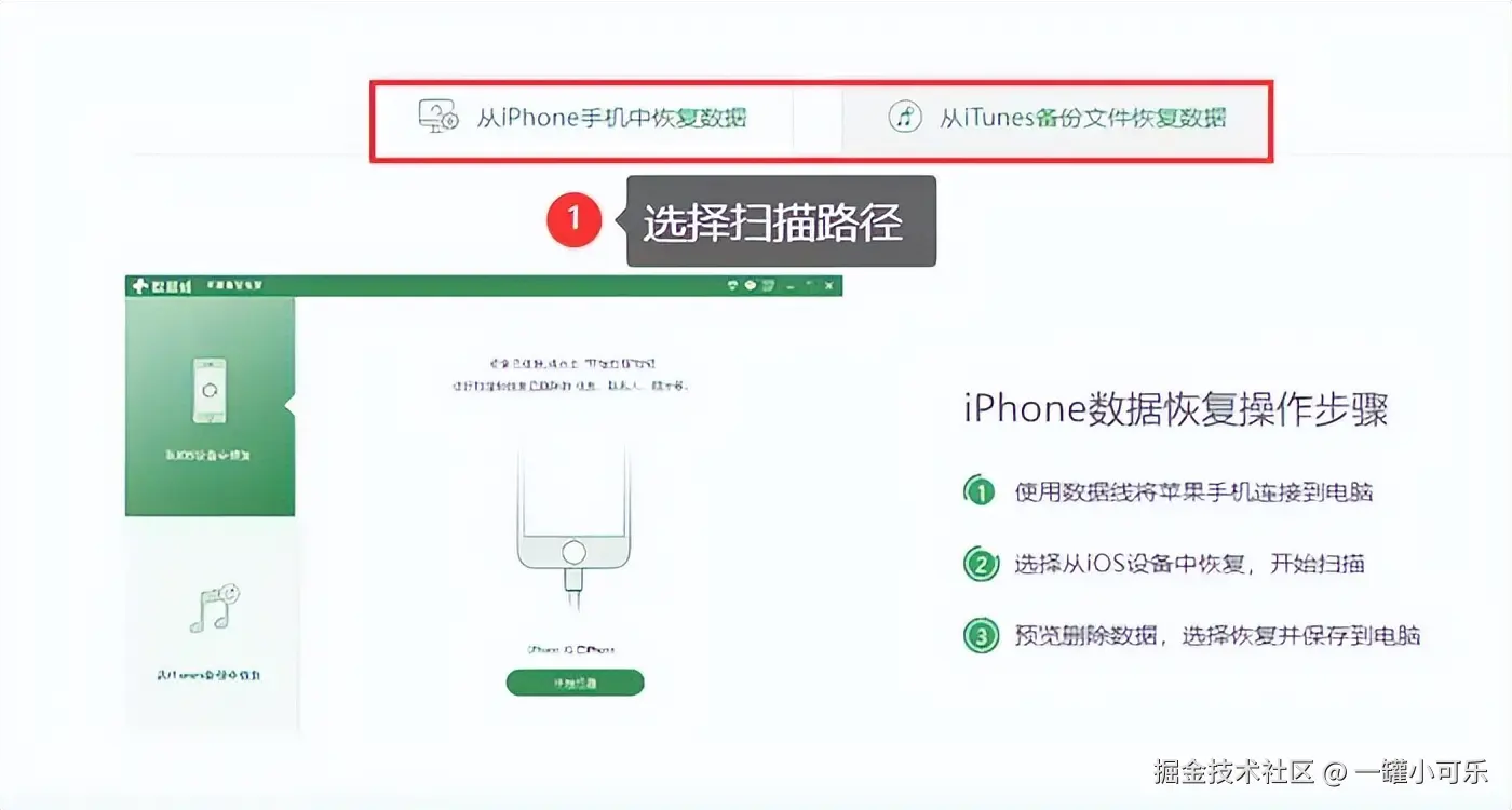 步骤2:选择从iPhone手机中恢复或者是从iTunes中恢复,点击 【开始扫描】 ,并在手机上确认是否信任此电脑对手机数据进行扫描。