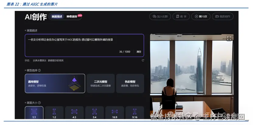 输入:一名女分析师正坐在办公室写关于AIGC的报告,透过窗子可以看到外滩的夜景