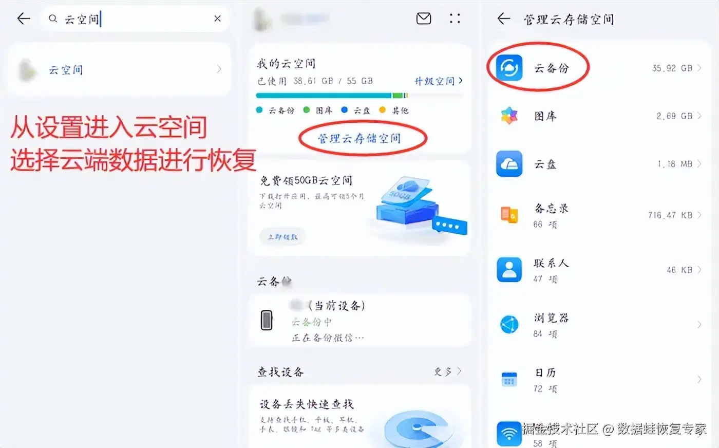 步骤1:手机设置搜索 【云空间】 进入,然后点击 【管理云存储空间】 。选择云备份进行恢复。