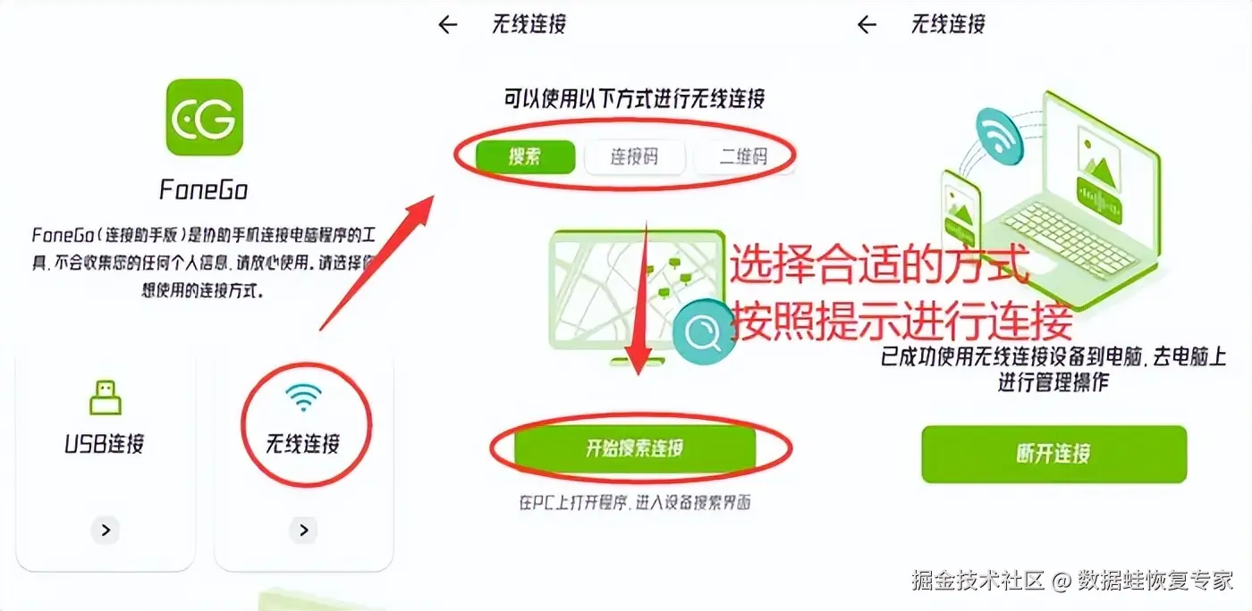 步骤1:将软件安装完成后,拿出需要恢复数据的华为手机,下载安装连接助手。然后打开助手,选择适合自己的方式,连接到电脑。