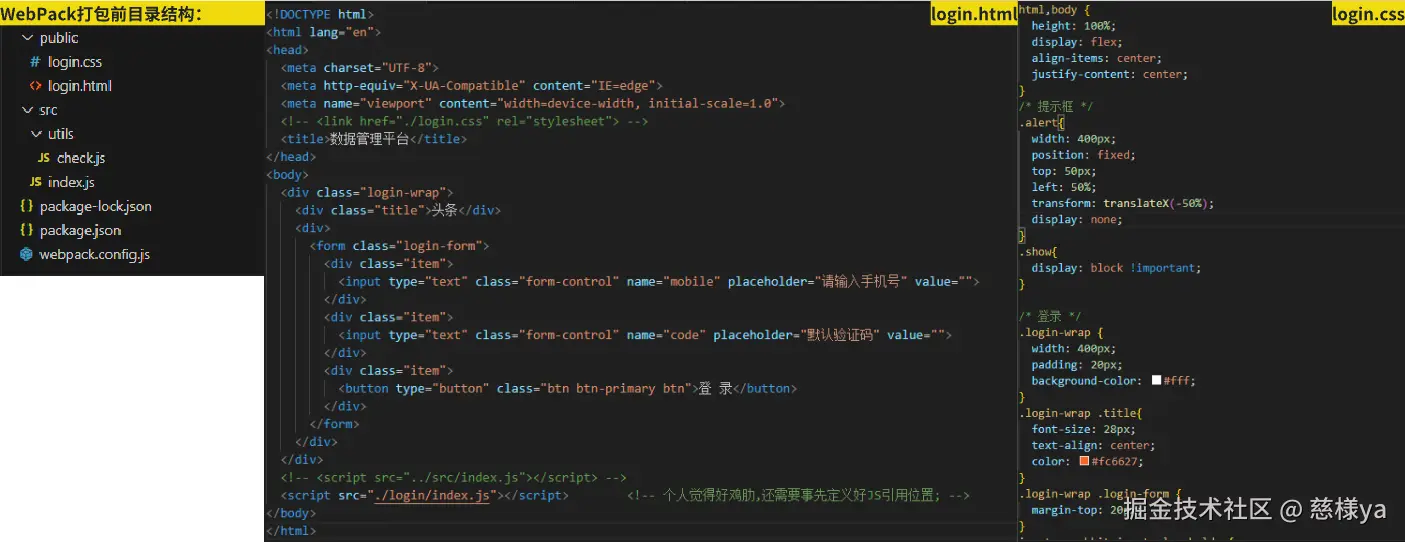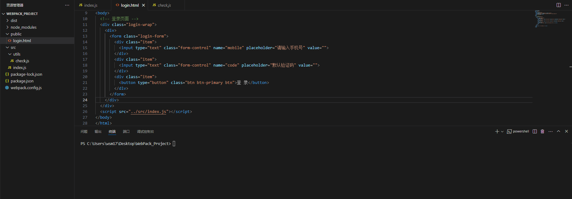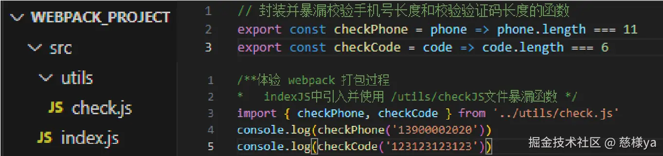 src/utils/check.js封装并暴漏校验手机号长度和校验验证码长度的函数//封装并暴漏校验手机号长度和校验验证码长度的函数 export const checkPhone = phone => phone.length === 11 export const checkCode = code => code.length === 6src/index.js引入并使用 /utils/checkJS文件暴漏函数/**体验 webpack 打包过程 * indexJS中引入并使用 /utils/checkJS文件暴漏函数 */ import { checkPhone, checkCode } from '../utils/check.js' console.log(checkPhone('13900002020')) console.log(checkCode('123123123123'))