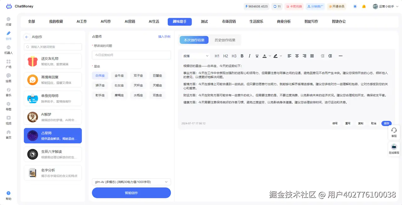 - 输入想要咨询的问题,选择星座,AI占星师就会开始帮你占星啦!