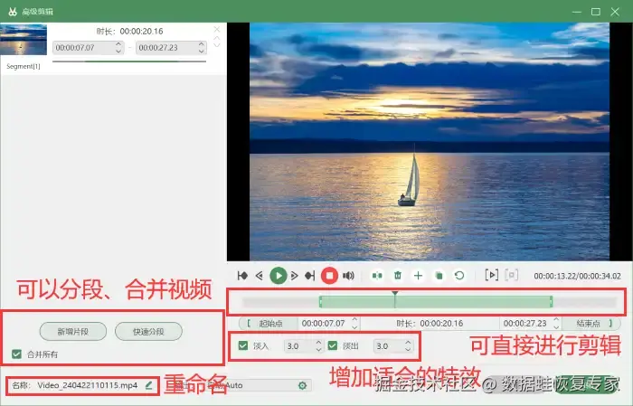 第四步:录屏结束后,您可以直接预览视频进行保存或者点击进入 【高级剪辑】 页面,对视频进行分段、剪辑、增加特效等操作,也可对视频进行重命名方便您日后的查找与分享。编辑完毕后,点击 【剪辑】 即可保存视频结束本次录制。