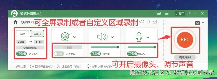 第三步:在 【视频录制】 界面,您可以选择全屏录制或者自定义区域录制,还能设置排除窗口,在录制的过程中保护您的个人隐私。同时需要您对摄像头、录制的声音进行调整,设置完毕后,点击红色按钮 【REC】 即可进入录屏。