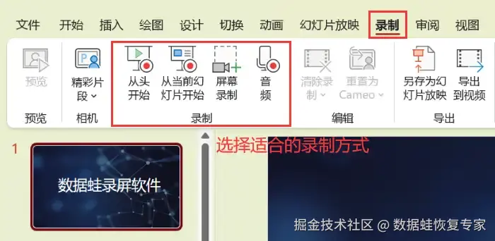 第一步:打开PPT文稿,点击上方的 【录制】 ,选择您需要的录制方式。这里以【屏幕录制】作为演示。