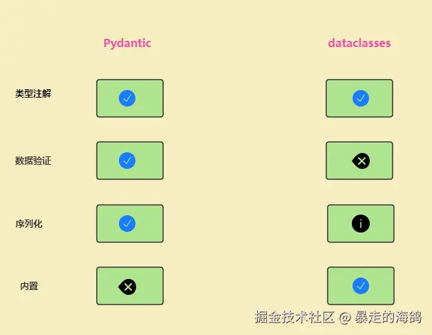 Pydantic和内置的dataclasses非常的像,主要区别在于Pydantic拥有更加强大的数据验证和序列化功能。