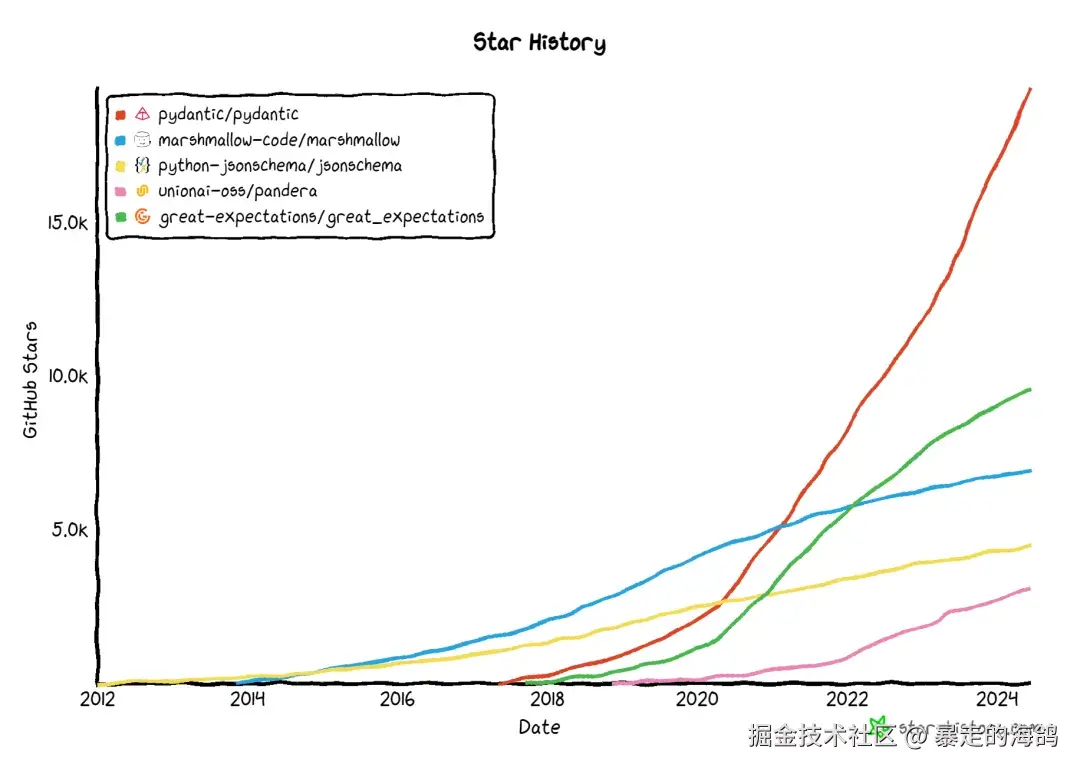 目前,Python 中主流的数据验证库还有不少,但是 Pydantic 无疑是那个星星增长最迅猛的。