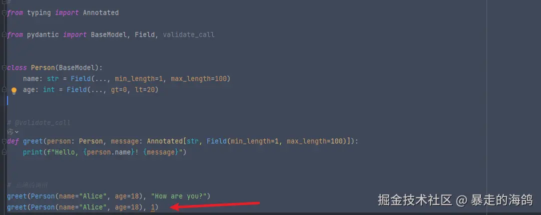 Pydantic 自动根据模型定义进行数据验证。它会检查字段的类型、长度、范围等,并自动报告验证错误,Pydantic 会提供信息丰富且可读的错误消息,包括错误的位置、类型和输入。你可以使用 ValidationError 异常来捕获验证错误。