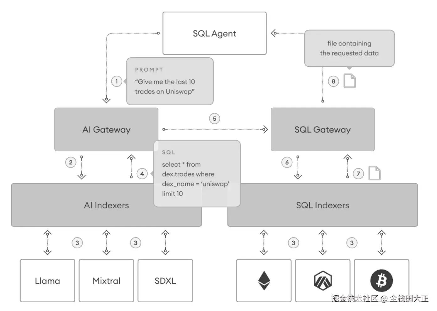 2022 年,OpenAI 推出了以 GPT-3.5 为基础的 ChatGPT,虽然 ChatGPT 在多数情况下能有效处理问题,但在需要特定领域知识或实时数据时可能表现受限。例如,它不能提供关于 Vitalik Buterin 过去 18 个月内的代币交易记录的详尽信息。为了解决这一问题,The Graph 核心开发团队 Semiotic Labs 与 OpenAI 合作,推出了 Agentc 项目,这是一个能够为用户提供加密货币市场趋势分析和交易数据查询服务的项目。