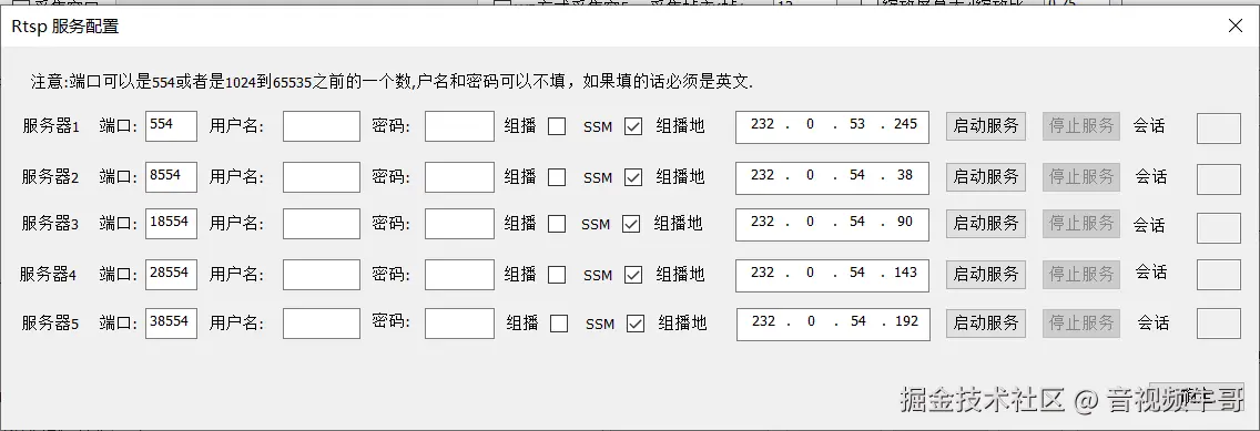 点击“配置查看Rtsp服务”按钮,选择一个端口,点“启动服务”,如需启动多端口服务(对应多个拉流url),点“确定”,返回上级界面: