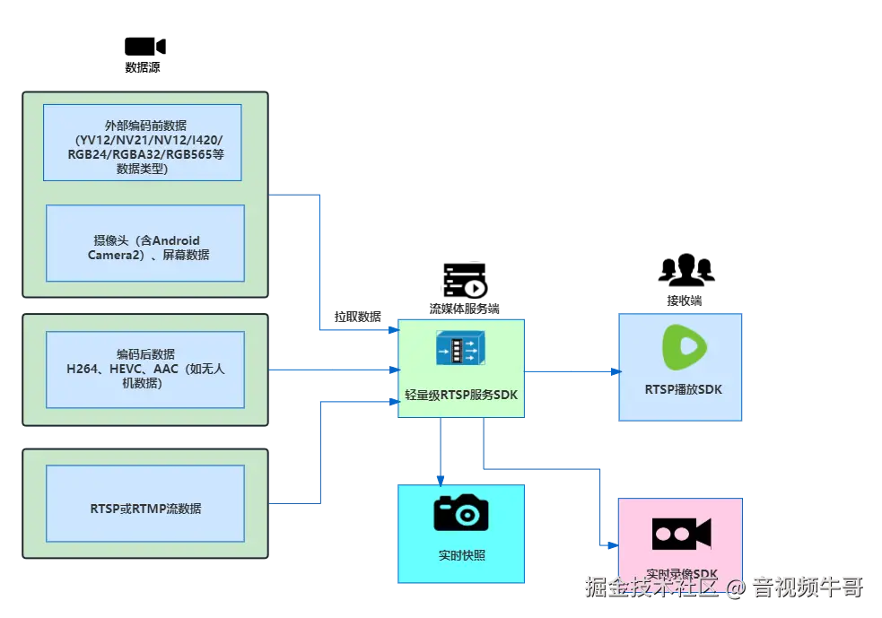 除了可以采集编码前数据外,还可以对接编码后的H.264、H.265、AAC数据,也可以配合拉流模块,拉取外部RTSP或RTMP流,汇聚到轻量级RTSP服务。
