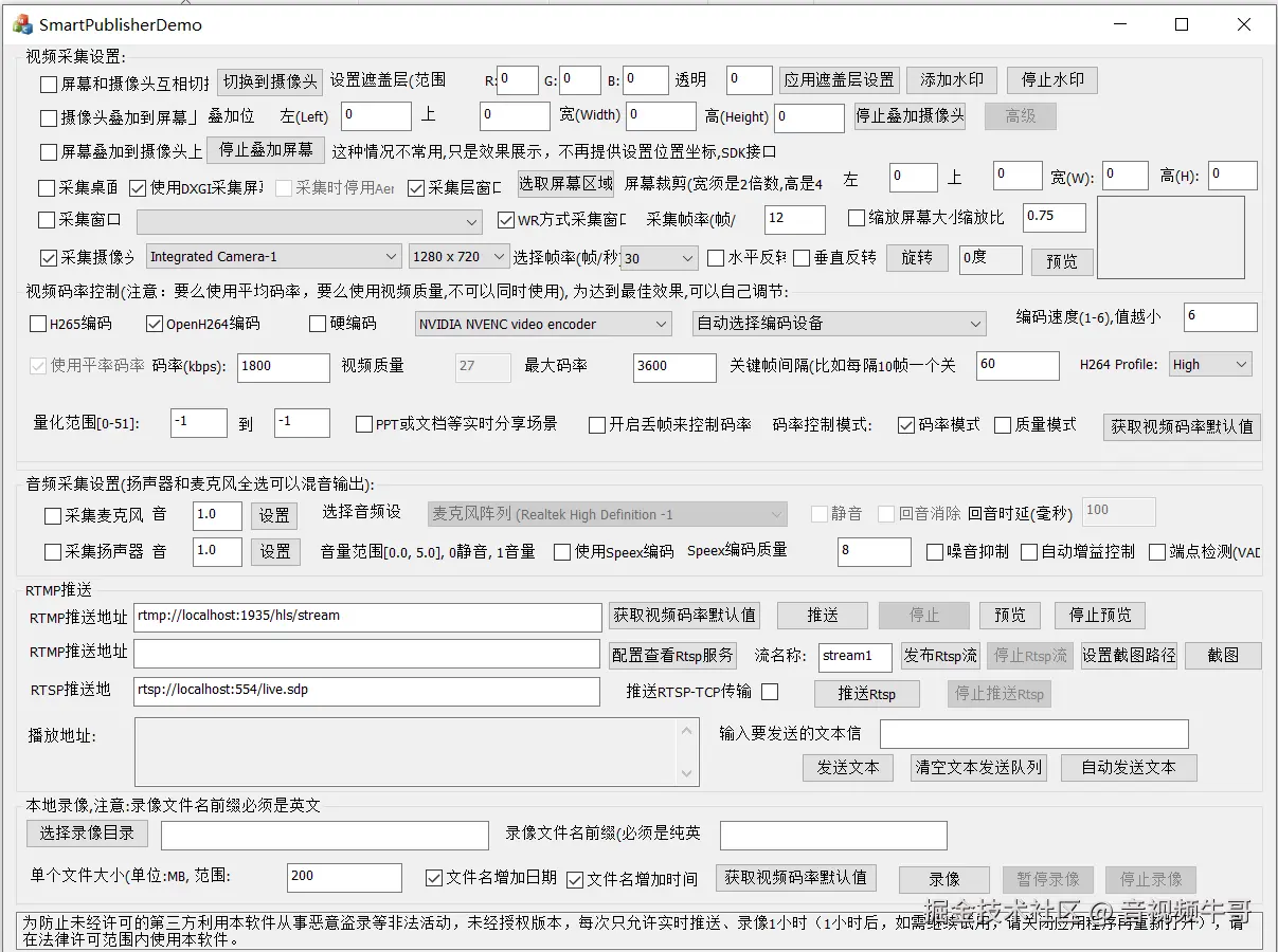 启动大牛直播SDK的SmartPublisherDemo.exe,先选择摄像头,配置分辨率、帧率码率,“采集摄像头”-->选择需要共享的摄像头,并选择分辨率和帧率,如果需要采集麦克风或扬声器,勾选即可。