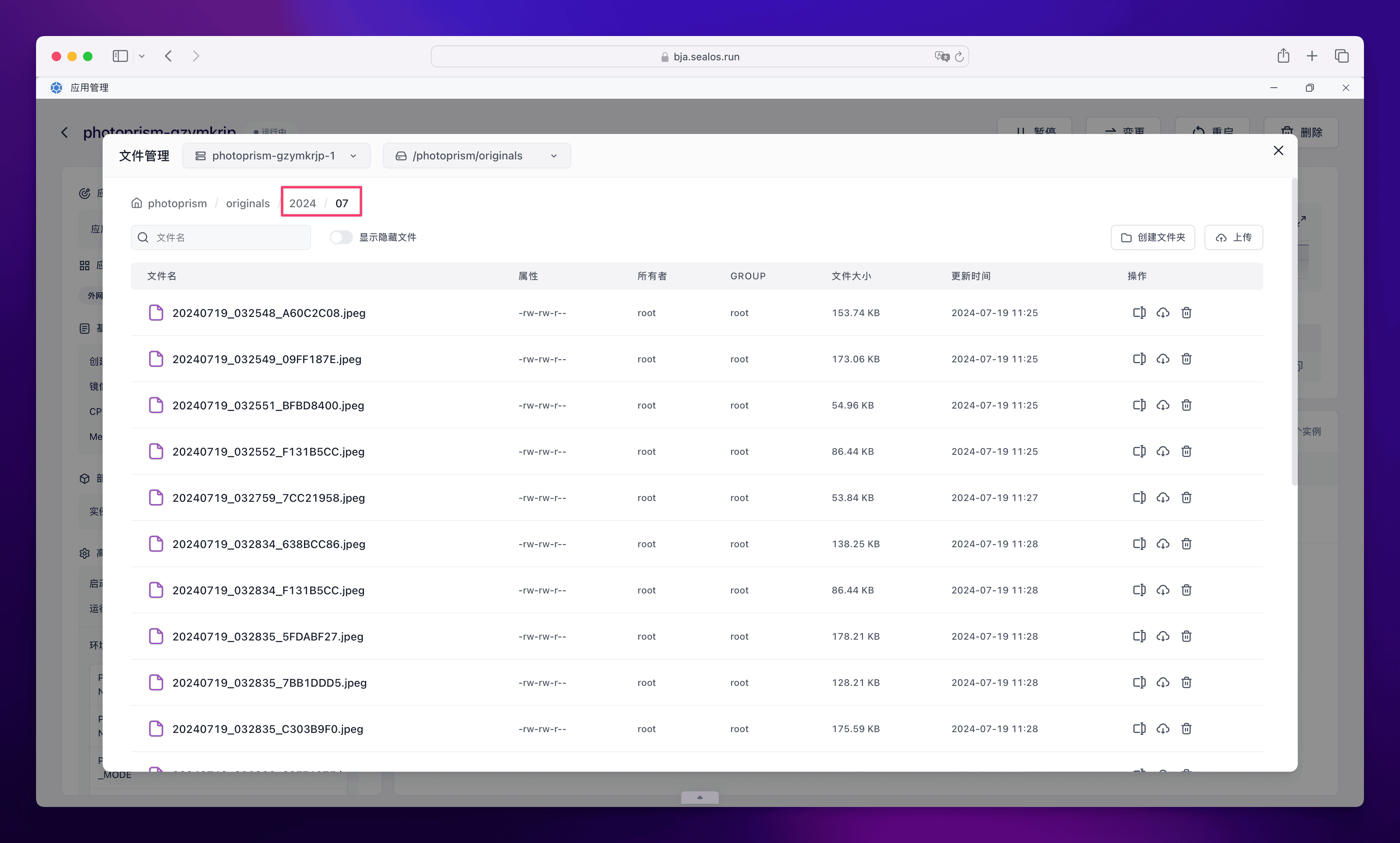 可以看到神仙姐姐的照片都被放在 2024/07 目录下,因为这是 2024 年 7 月的照片,每个照片都以时间 + 随机码来命名。