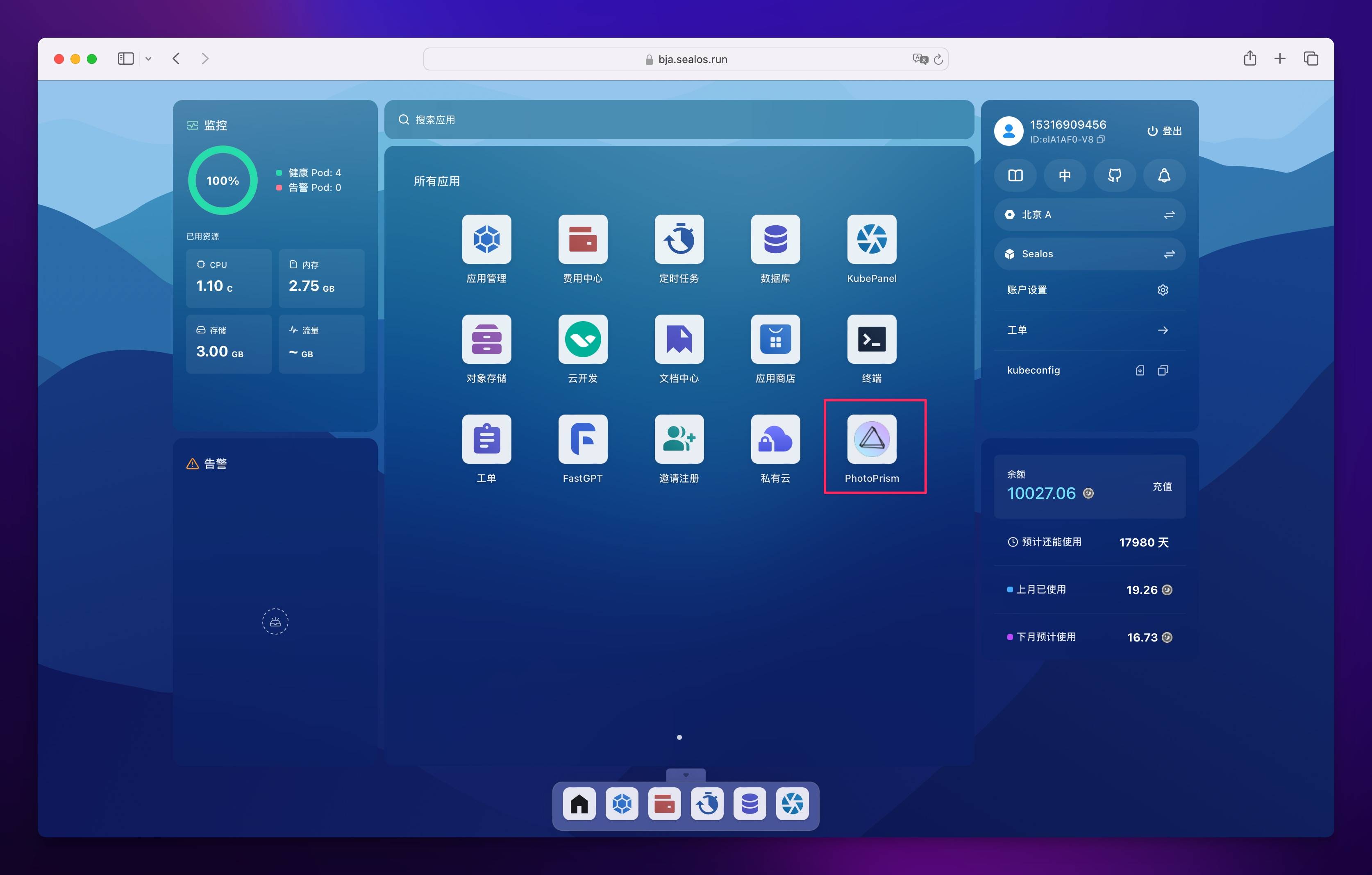 除此之外,还有另外一种打开方式,先刷新 Sealos 桌面 (也就是在 cloud.sealos.run 界面刷新浏览器),然后你就会发现 Sealos 桌面多了个图标: