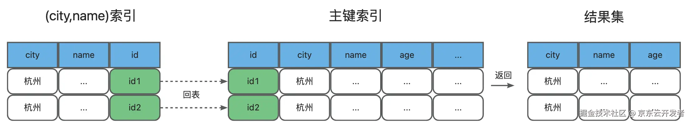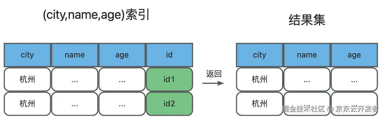 你是不是觉得到此为止了?还可以再优化下哦,如果创建一个(city,name,age)的联合索引,那么这个联合索引对于这个SQL来说就成了覆盖索引,流程简化成了这样: