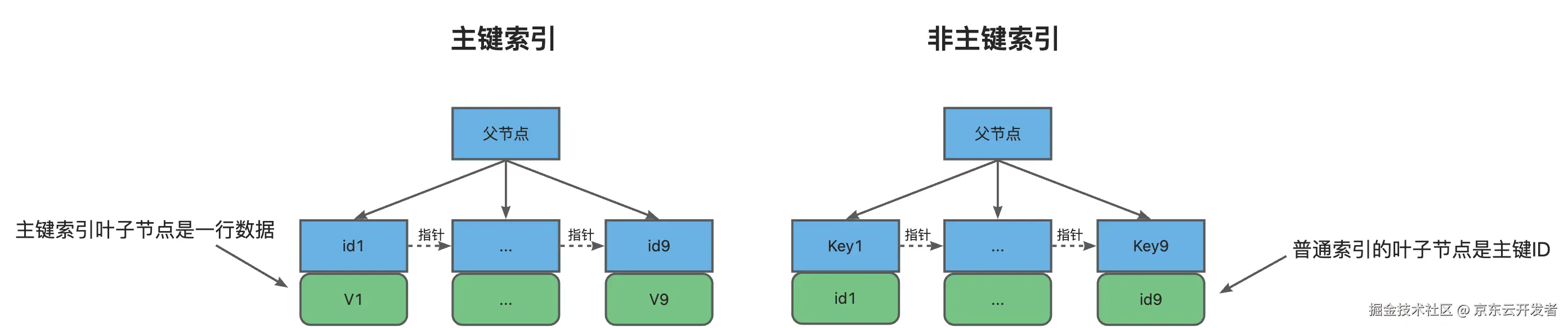 数据结构上: B树所有节点都可包含记录,而B+树只有叶子节点存储数据,非叶子节点只用于索引,不存储实际数据。