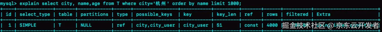 此时你已经很清楚,为了避免全表扫描,需要在city字段上加索引,我们用explain命令看一下这条SQL执行情况: