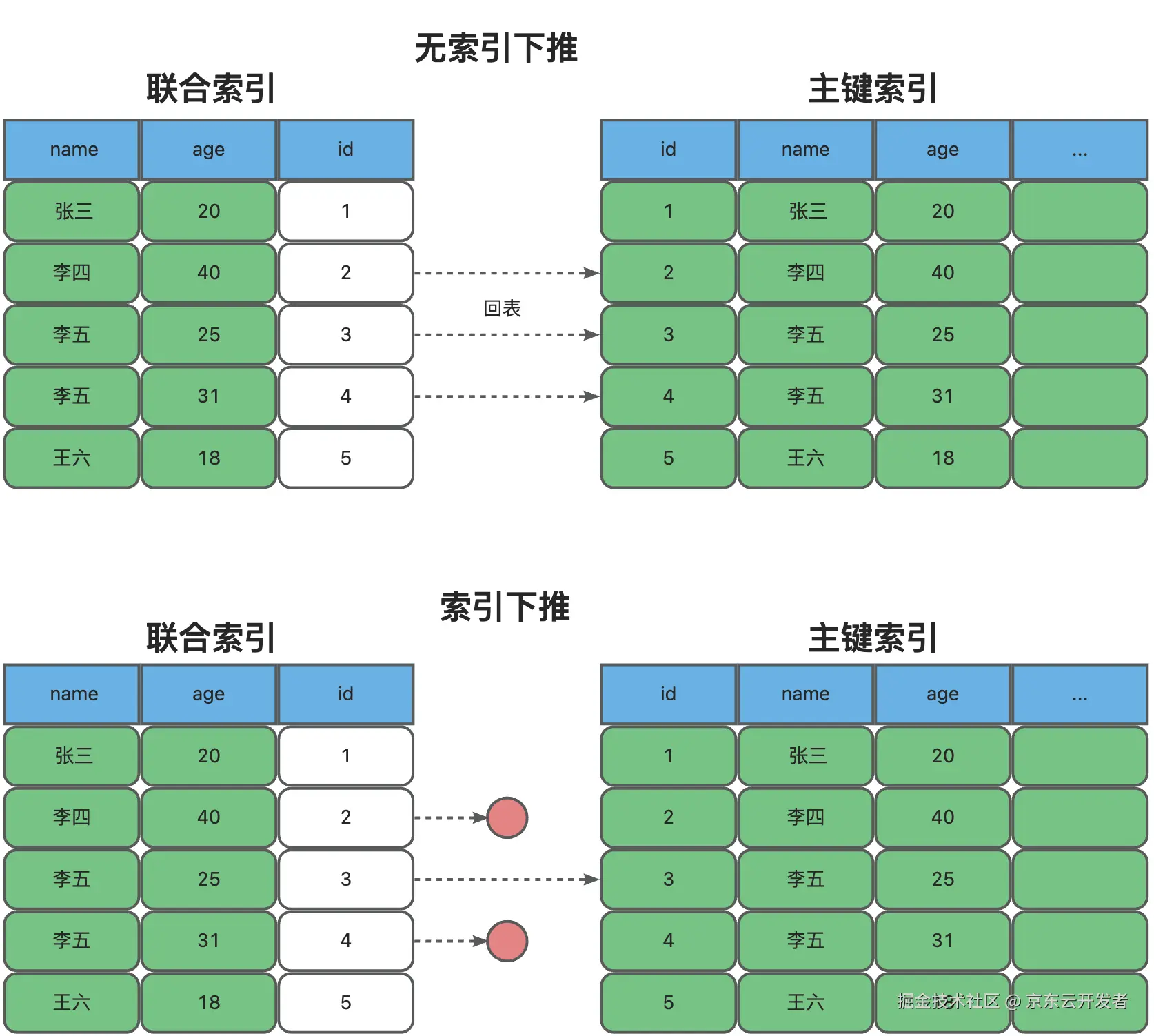 无索引下推机制时,根据最左前缀匹配原则,找到“李%”的name之后,就回表查询主键索引,然后过滤age字段。索引下推机制下,在寻找“李%”name时,会直接判断age=25符合条件的数据,然后回表查询主键索引,减少了2次回表次数。