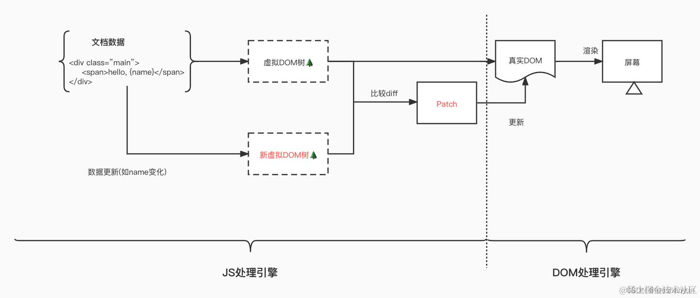 每次数据更新时,重新计算 Virtual DOM ,并和上一次生成的 Virtual DOM 做对比,对发生变化的部分做批量更新。