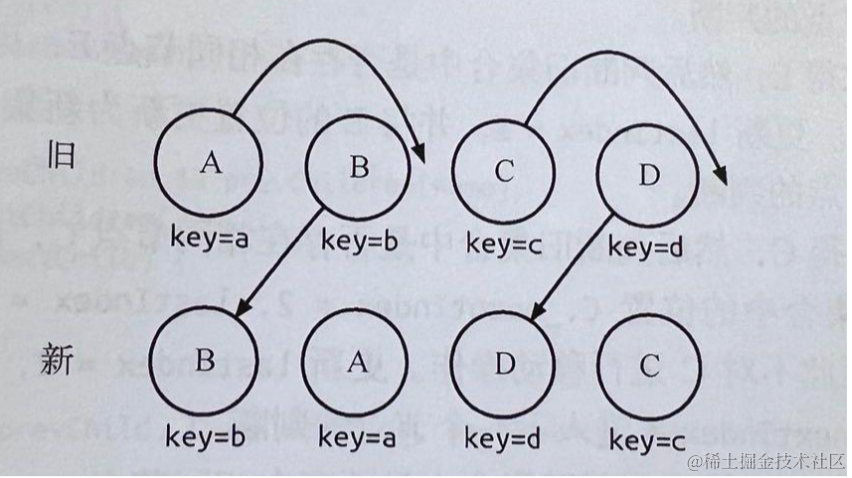 移动:旧集合里有新组件类型,且 element 是可更新的类型,通过移动操作实现 DOM 节点复用。