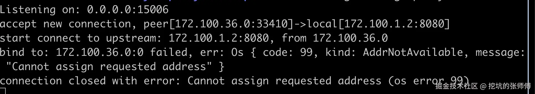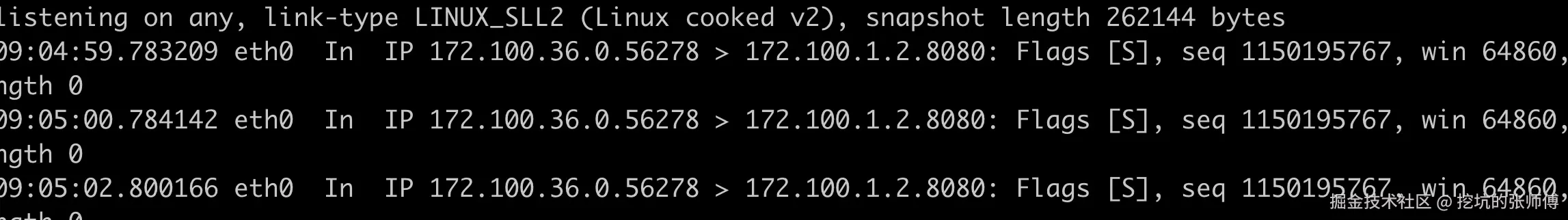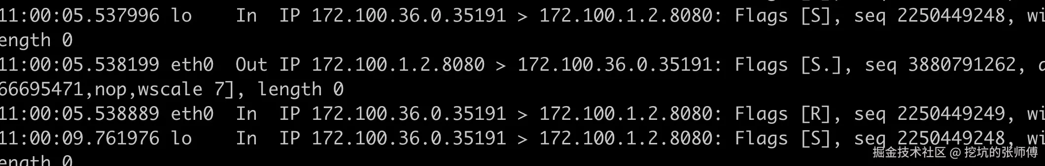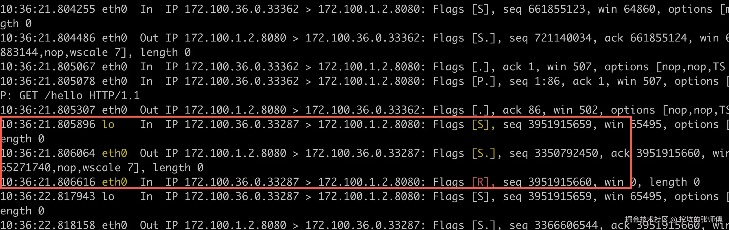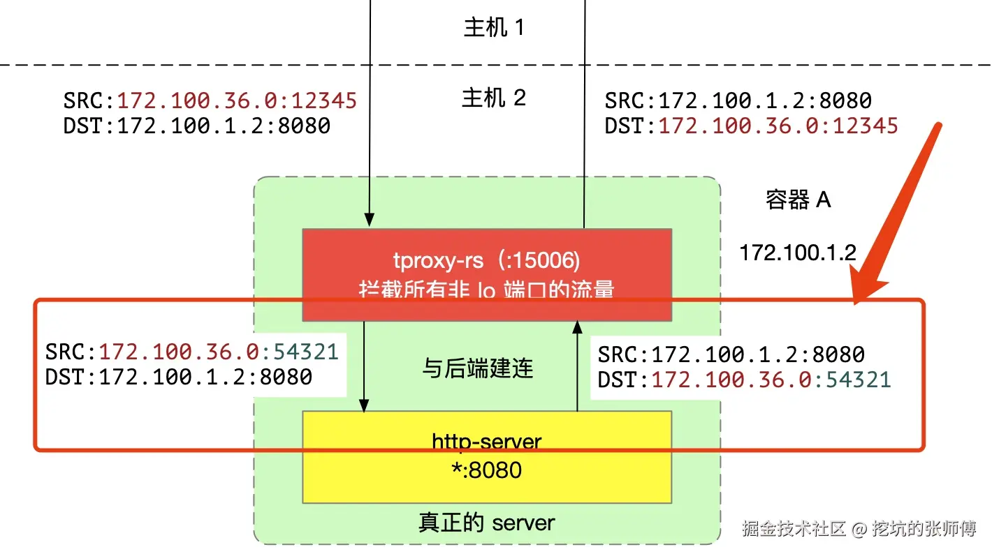 通过查看 conntrack,我们可以看到如下映射:172.100.36.0:39882<->172.100.1.2:8080 被 NAT 到 172.100.1.2:15006 <-> 172.100.36.0:39882