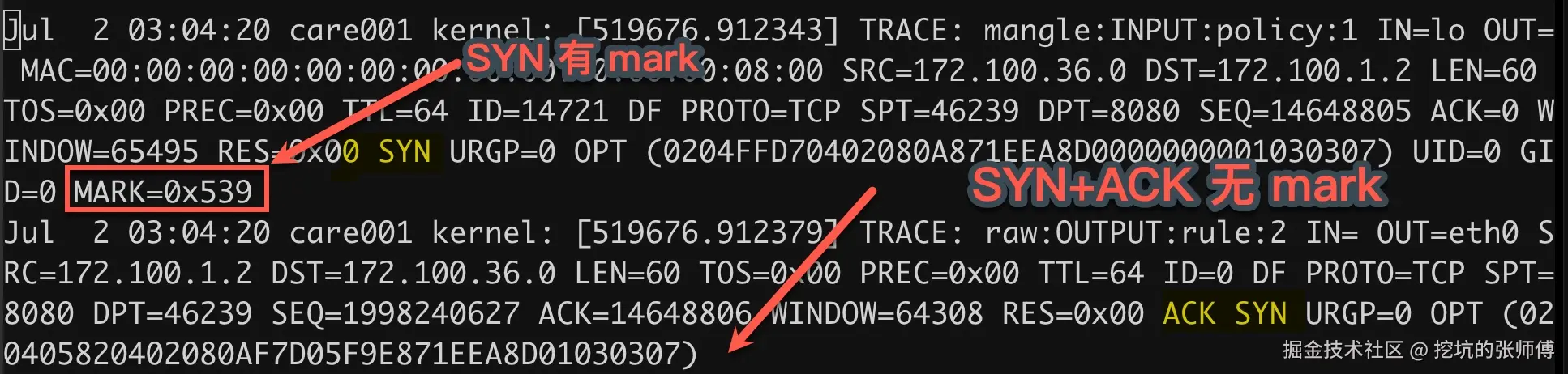 - 发起的 SYN 包:通过 SO_MARK 选项成功地带上了 0x539 标记。