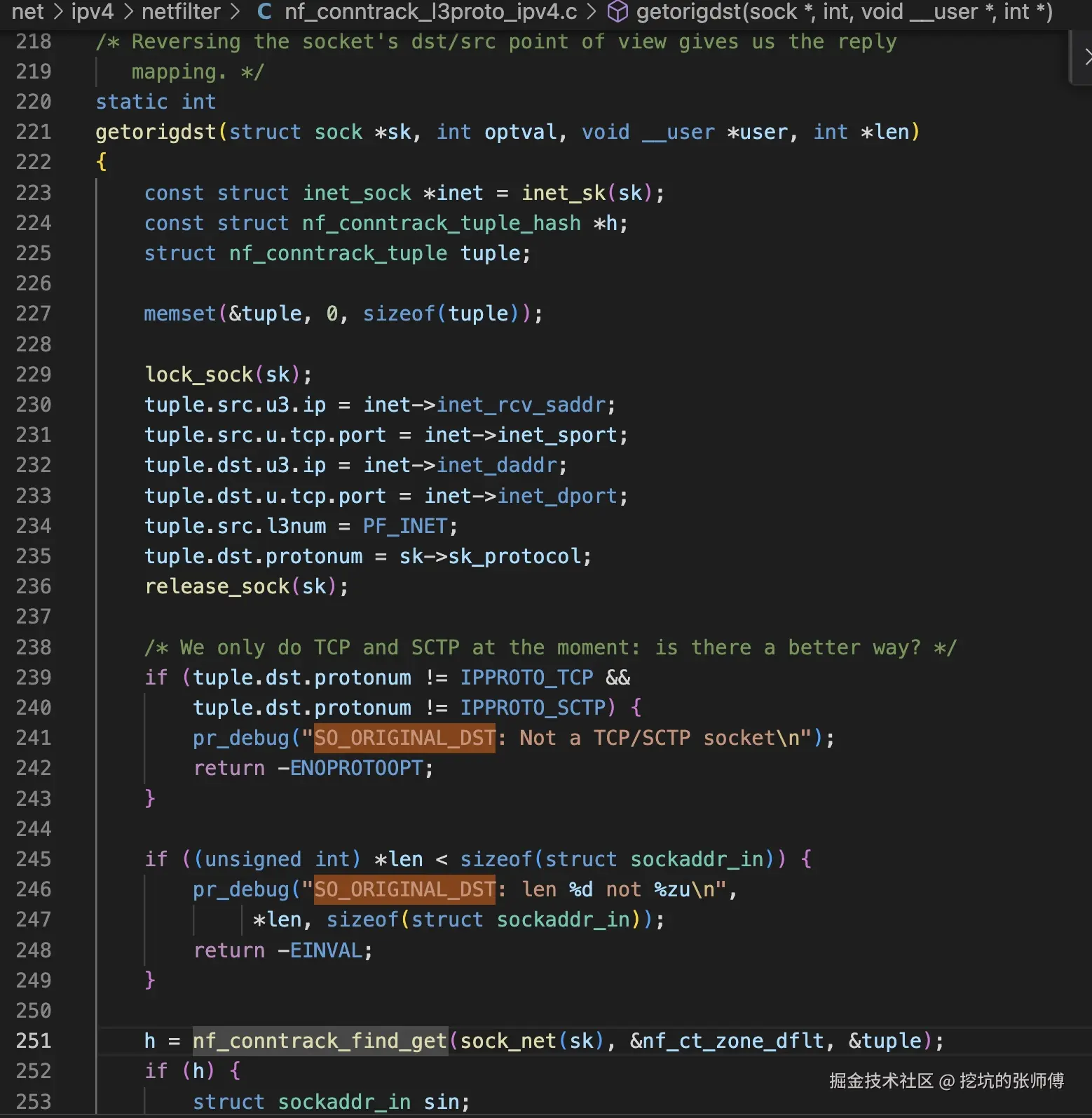 不过我们不需要直接操作 conntrack,socket 提供了一个 api 可以用来获取,典型的用法如下:
