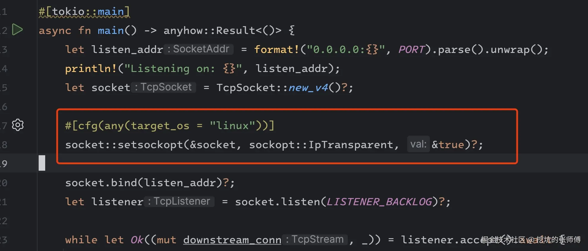 // socket::setsockopt(&socket, sockopt::IpTransparent, &true)?;