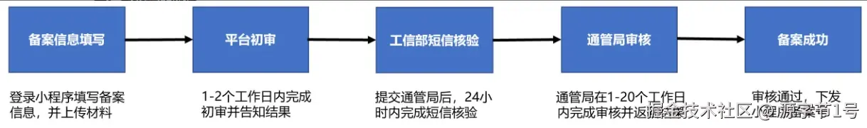 目前,微信小程序备案整体流程总共分为五个环节:备案信息填写、平台初审、工信部短信核验、通管局审核和备案成功。正常备案流程最少要5-10个工作日,建议大家尽快处理。 如若转载,请注明出处:开源字节 sourcebyte.vip/article/370…