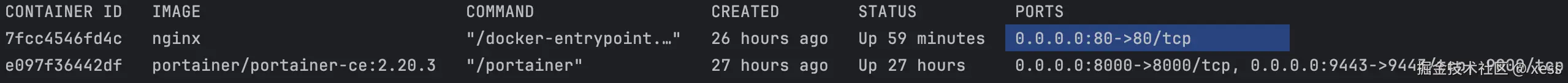 如果这里写成 127.0.0.1:80->80,那么只能从本机访问 docker服务,如果写成 0.0.0.0:80->80,