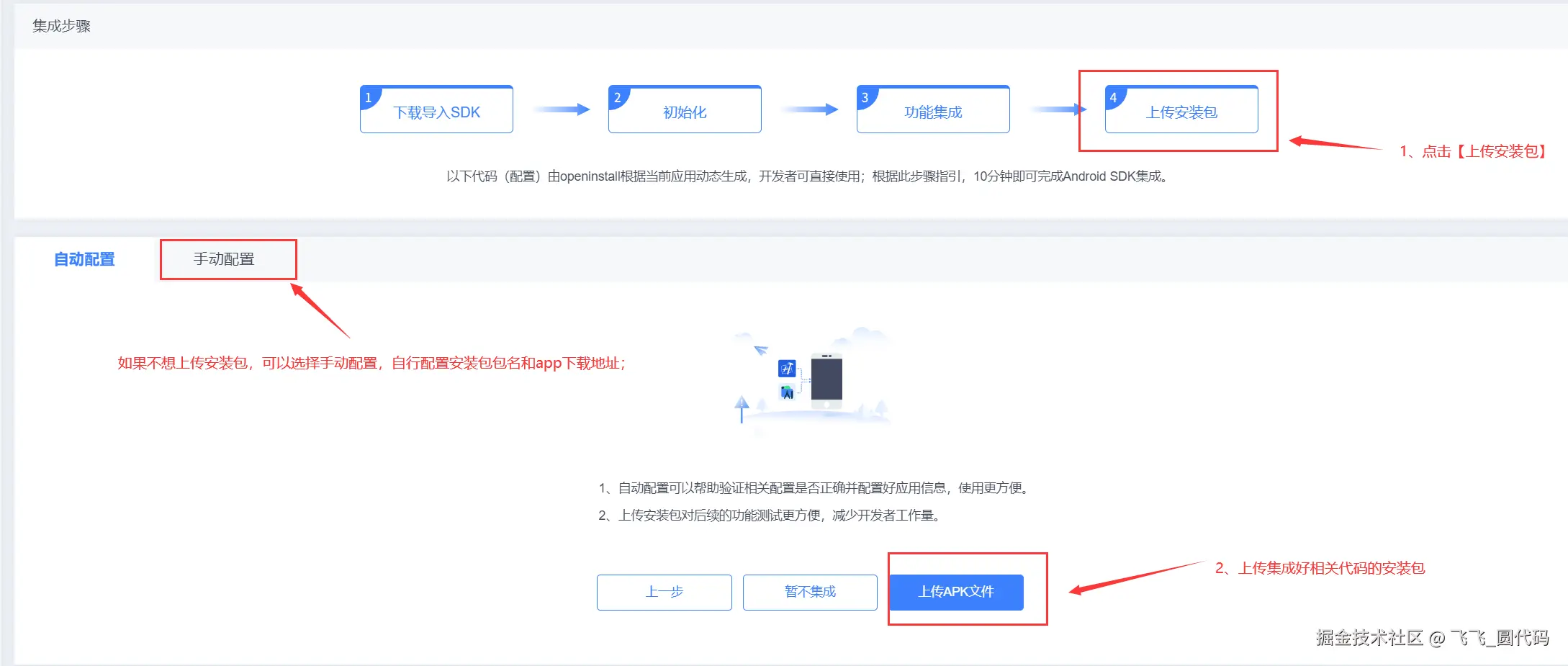 4、应用集成好之后,需要将集成好的【apk文件】或者【ipa文件】上传到后台,系统将自动检测集成情况,配置相关内容;如果不想要上传安装包,也可以选择【手动配置】,自行配置包名、App下载地址等内容。