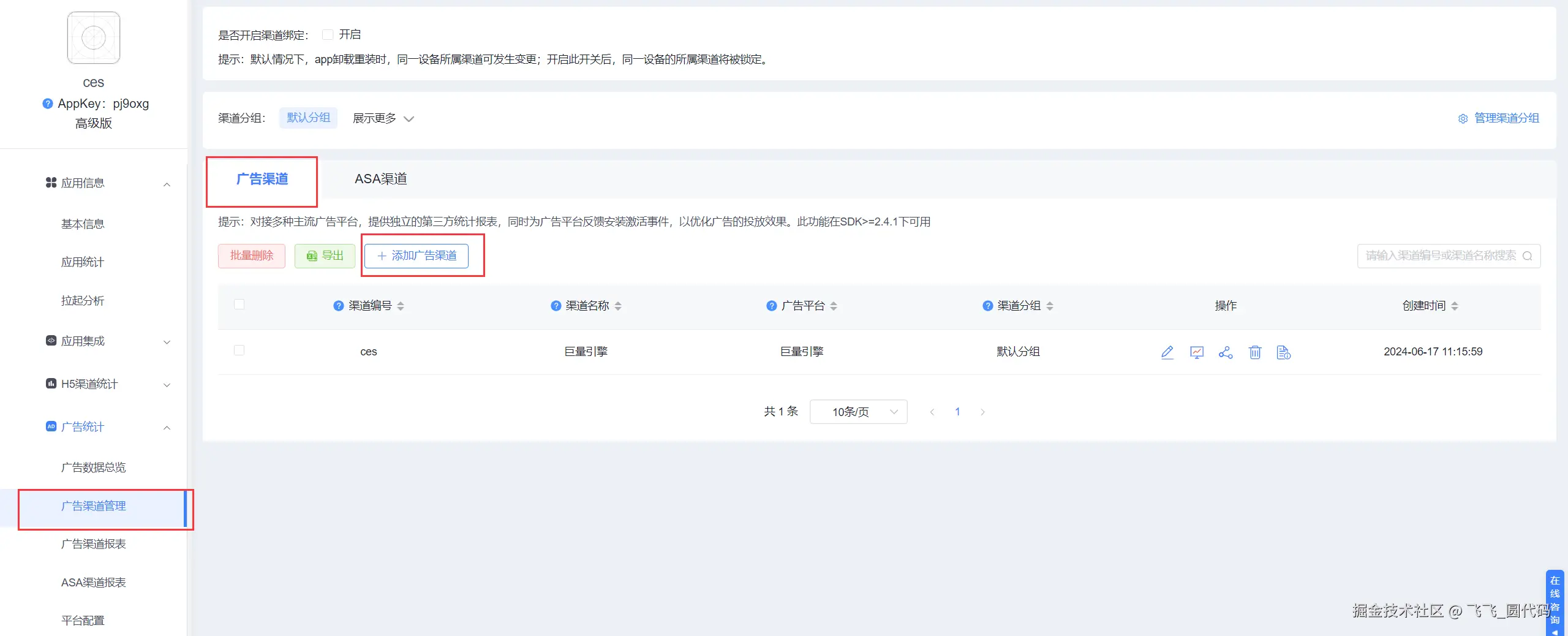 6、完成 openinstall SDK 以及广告的相关代码的接入之后,可以到 【控制台】—>【广告渠道管理】—>【添加广告渠道】—>根据自身广告计划的需要创建想要监测的【广告渠道】项目。