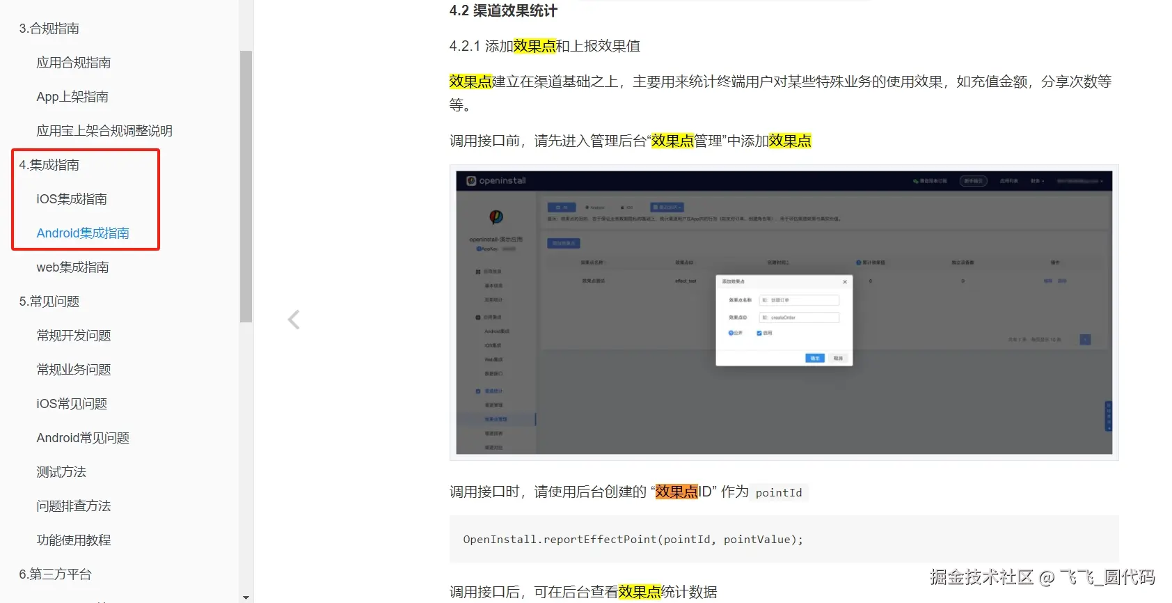 (2)创建好【效果点】之后,需要让技术人员在App端做好【效果点代码】埋点处理,详情可以到【集成文档】查看;用户在App端触发这个效果点后,将自动上报数据。