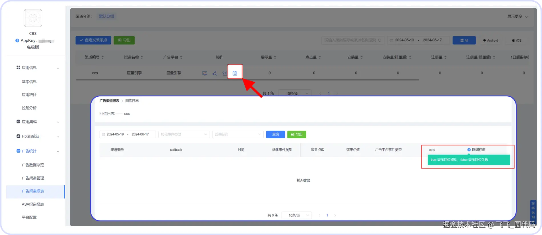 11、如果对应的广告平台渠道【安装量】有增加,但是广告平台没有接收到数据,可以到对应广告平台渠道的【回传日志】里面查看是否回传成功,【回传日志】就是回传数据给广告平台的日志。